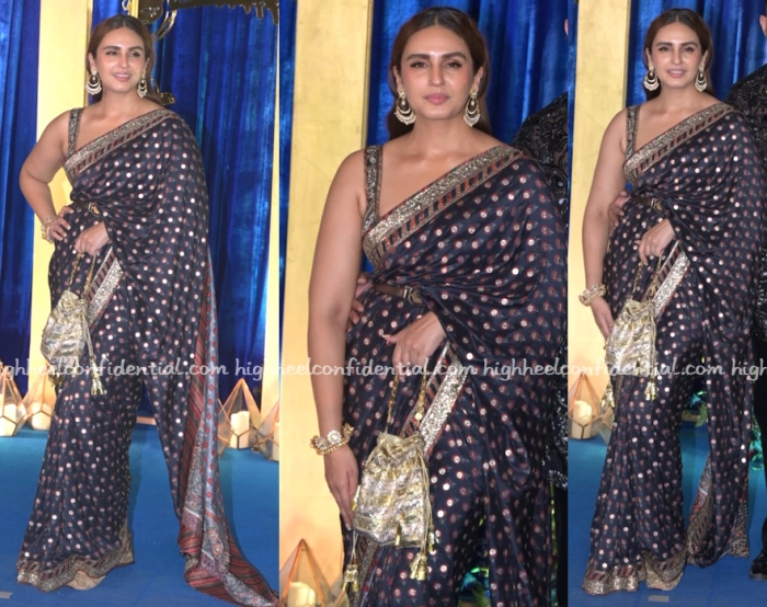 Huma attended the screening of a movie and then attended a Diwali party wearing a printed sari featuring an ajrakh print pallu from JJ Valaya. The sari was nice but the makeup here felt dull.