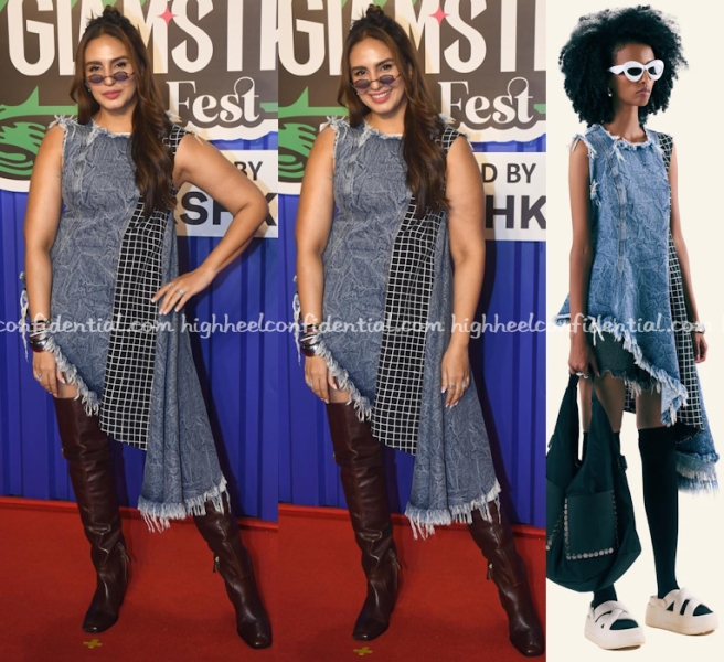 Huma was seen at an event Sunday evening wearing an asymmetrical patchwork denim top with denim shorts from One True Pairing. A stack of bracelet and thigh-high boots finished out her look. At first glance, I wasn’t loving this and possibly because of the really short shorts. Maybe an inch longer and I would’ve warmed up to this more. I also do not like those sunnies. It just looks so silly.