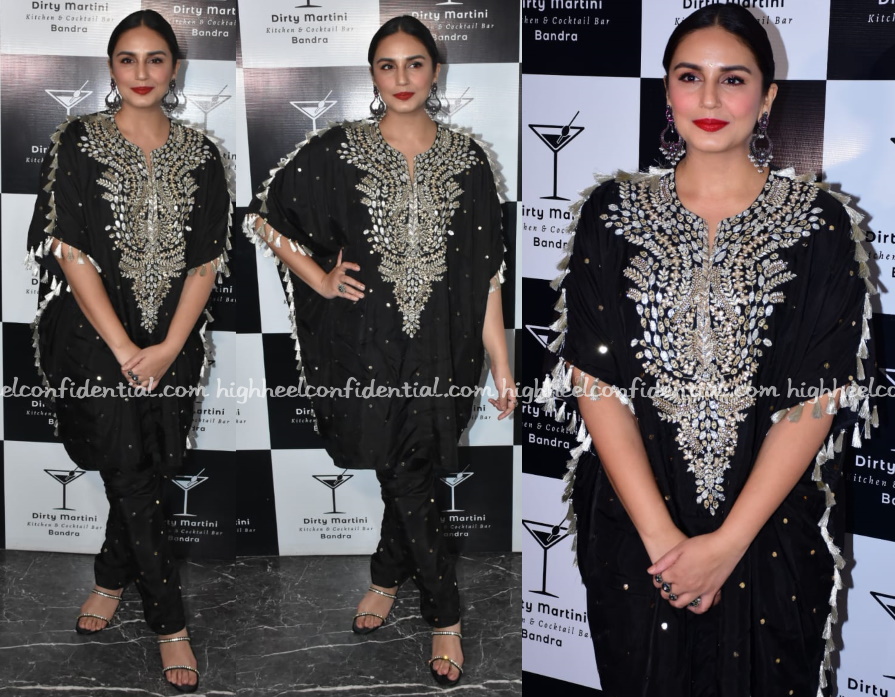 Huma hosted an Eid party earlier in the week and was seen waring a black Payal Singhal kaftan top and pants set. A red lip and black sandals finished out her look. She looked nice.