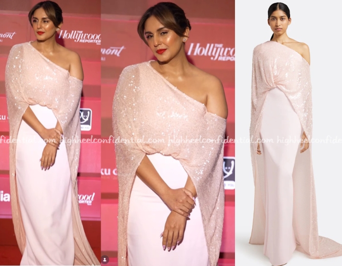 Huma attended Hollywood Reporter’s Women In Entertainment soiree wearing a pale pink Safiyaa dress featuring a sequin floor-length cape. A bold red lip, an updo and diamond studs finished out her look.