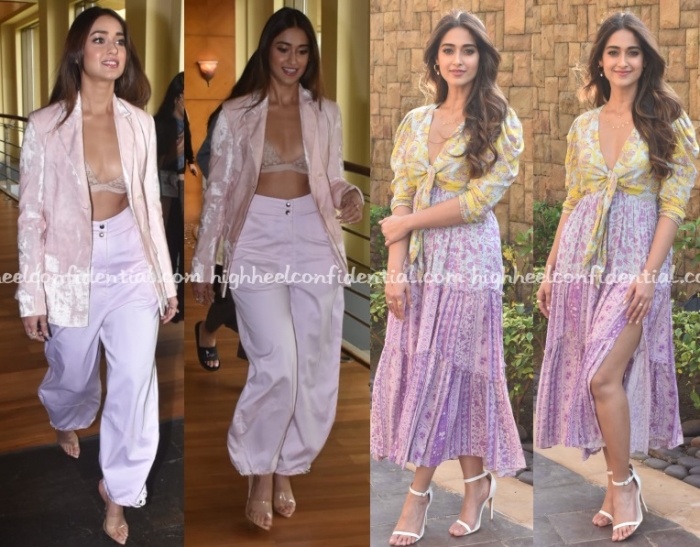 Ileana promoted her upcoming movie and was seen first in a paisley print dress and then in a Khanijo blazer and Ayesha Depala pants combo. Between the two, much preferred her in the dress. The separates look just may have been more effective if the pants didn’t feel so very over sized on her. Actually scratch that. That bralet is also killing it for me.