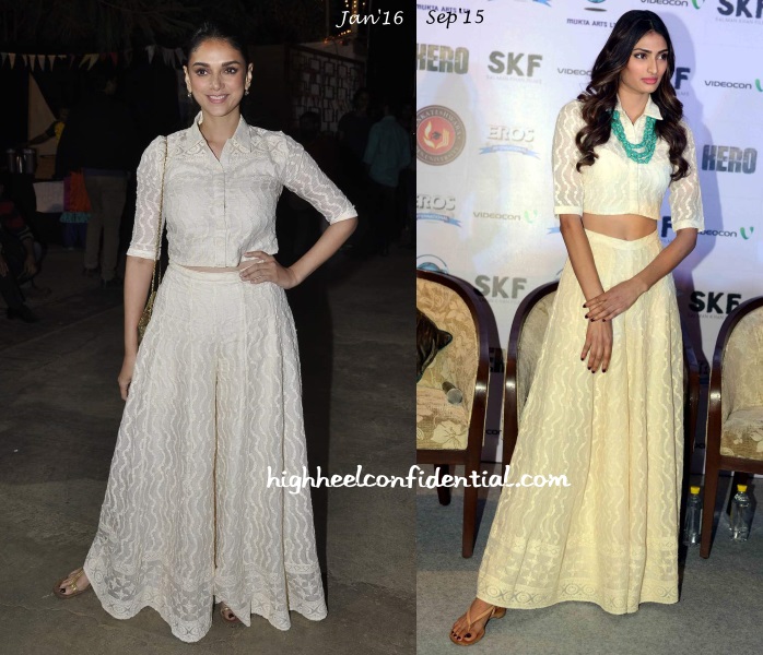 Aditi attended the closing ceremony of a theater festival wearing Anita Dongre separates. You’ll remember seeing the crop top and palazzo pants on Athiya as well last year while the latter was promoting Hero.