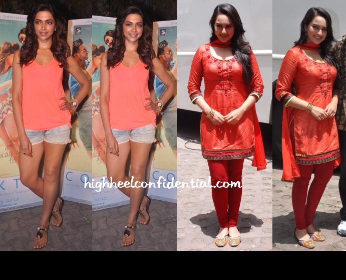 Making appearances in character were these ladies with Deepika sporting her bindaas look as ‘Veronica’ from Cocktail and Sonakshi her desi one from Rowdy Rathore.