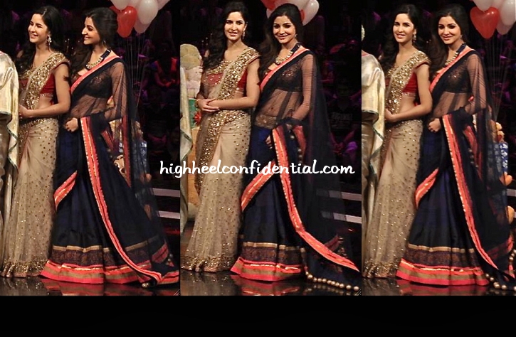 While on the sets of a popular TV show to promote their movie, the leading ladies both picked Manish Malhotra with Anushka opting for a lehenga and Katrina, a nude embellished sari.
