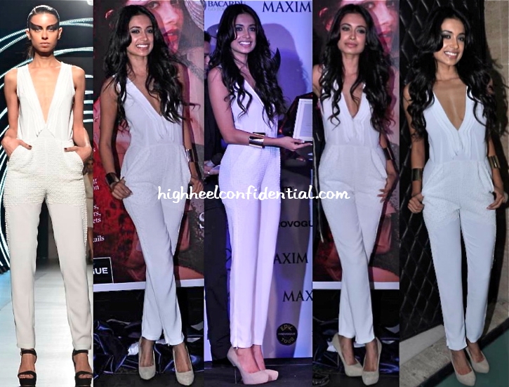 She looks good. But the look reminds me of something calendar launch last year Neha Dhupia had worn a similar white jumpsuit too…the shoes and the hair was also styled the same way. Only difference was Neha had stacked colored bangles rather than cuffs…