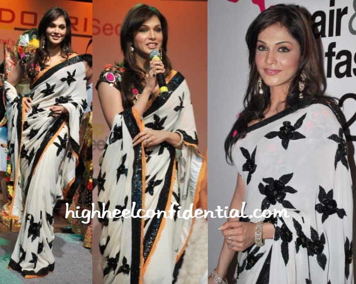 I think she looks great…and totally rocks the bizzare saree and blouse!