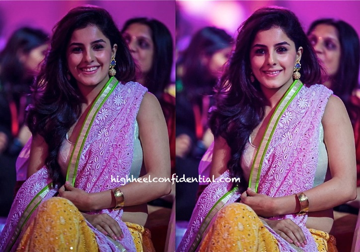 Isha was photographed on day one of SIIMA wearing a yellow and pink lehenga by Sonam & Paras Modi and jewelry by Aquamarine. Besides the blouse/choli feeling disconnected with rest of her lehenga, the look itself felt rather underwhelming.