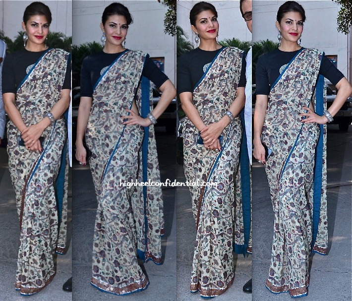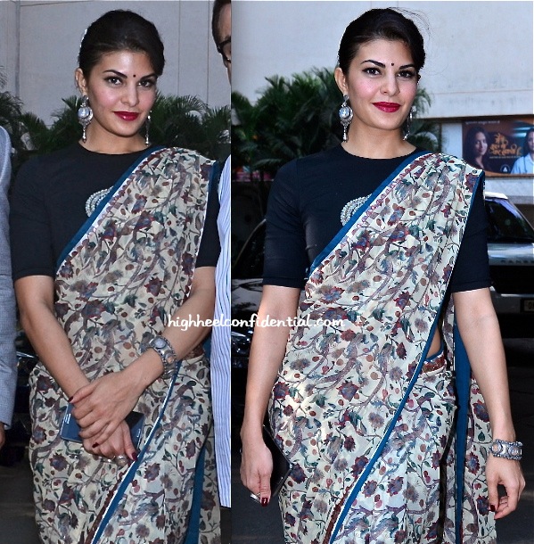 Wearing an Anamika Khanna sari, Jacqueline attended a recent event in Mumbai. Wearing her hair up, she finished out the look with Amrapali jewelry. Minus the choice of earrings (wish she had picked something smaller), she looked nice!