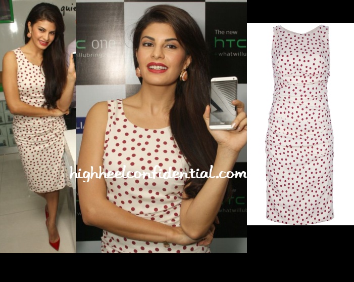 For the Delhi unveiling of the HTC One, Jacqueline opted for a simple look in a polka dot Dolce & Gabbana dress with red pointed pumps and gold stone earrings.