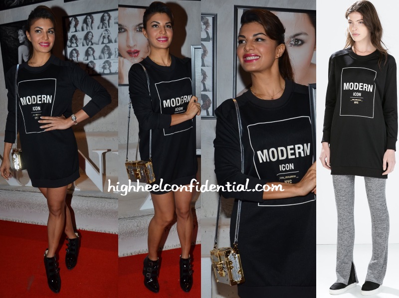 Jacqueline mixed high-street with high-fashion sporting a Zara dress with a Louis Vuitton Petite Malle box clutch, whose $4000+ price tag could make many a peeps faint. 😛