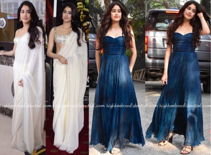That shade of blue is awesome! The dress is pretty and youthful and looks great on Jhanvi… the saree look is too bare for my liking!
