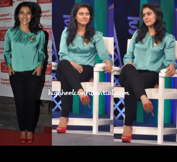 Kajol kept it casual for her appearance on NDTV in a green silk top, black denims and red pumps with a brooch by Viange finishing out the look.