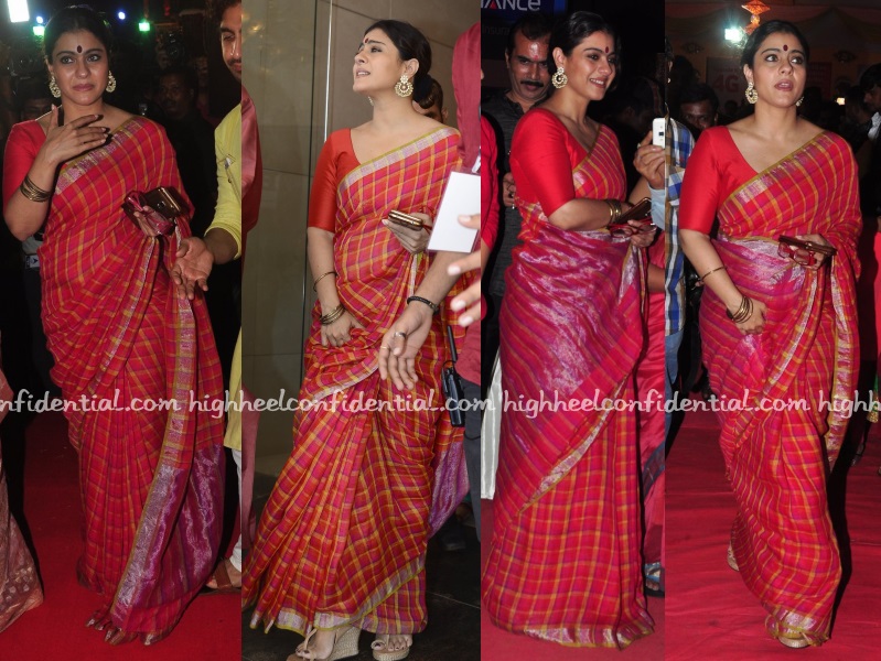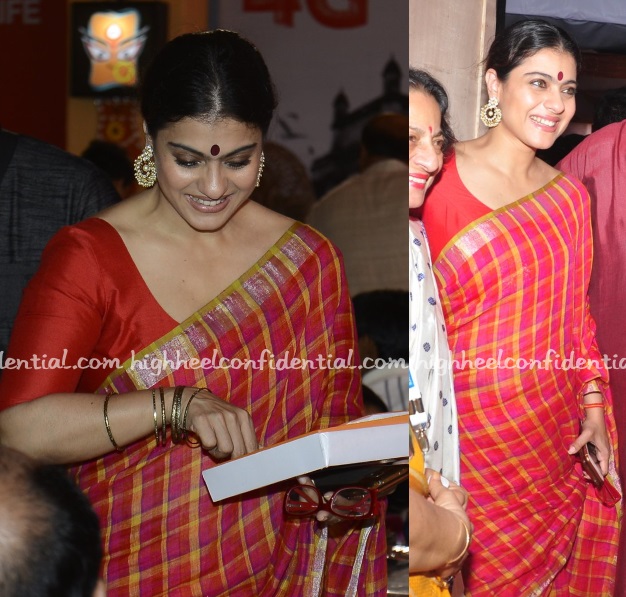 Kajol attended Saptami (7th day) celebrations on Saturday in Mumbai wearing a checkered Anavila sari and kundan earrings. With everyone opting for lehengas or shararas these days, I always love a sari sighting and this one was no different.
