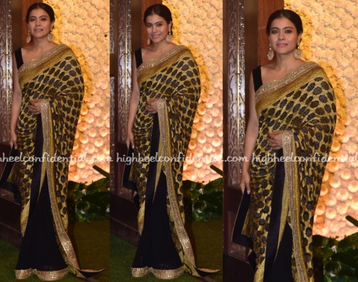 Kajol opted for a Manish Malhotra sari to wear to the Ambani Ganesh Chaturthi celebrations wearing the black and gold bandhani sari with chaand baalis. She looked good!
