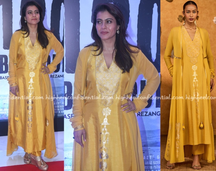 Kajol attended a screening and some work commitments (taping for something with Lilly) wearing a mustard colored kurta set from Masaba paired with Aprajita Toor kolhapuri wedges. I know those wedges are comfy but they feel too heavy to be paired with the kurta.