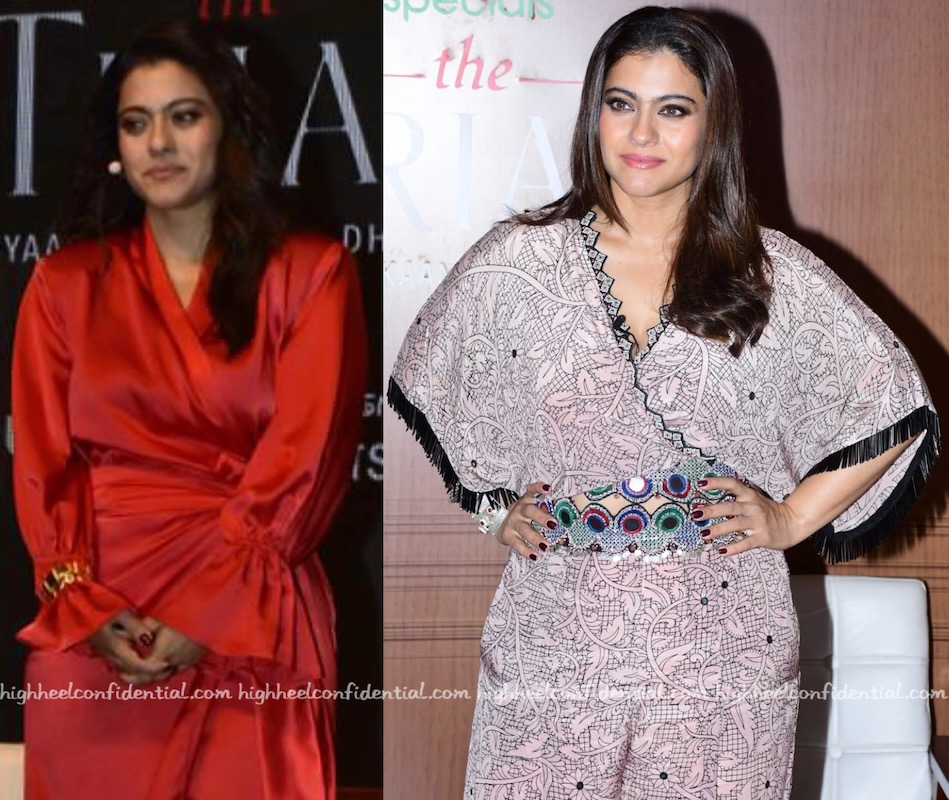 Back to back promotions had Kajol wearing a red wrap dress at one event and a Nupur Kanoi jumpsuit at another. I don’t think either look does much for the actor. The red looks dated and as for the jumpsuit, I don’t know if this particular kind of de-bo aesthetic is up her alley. She sure isn’t selling it to me.