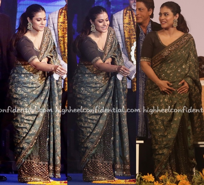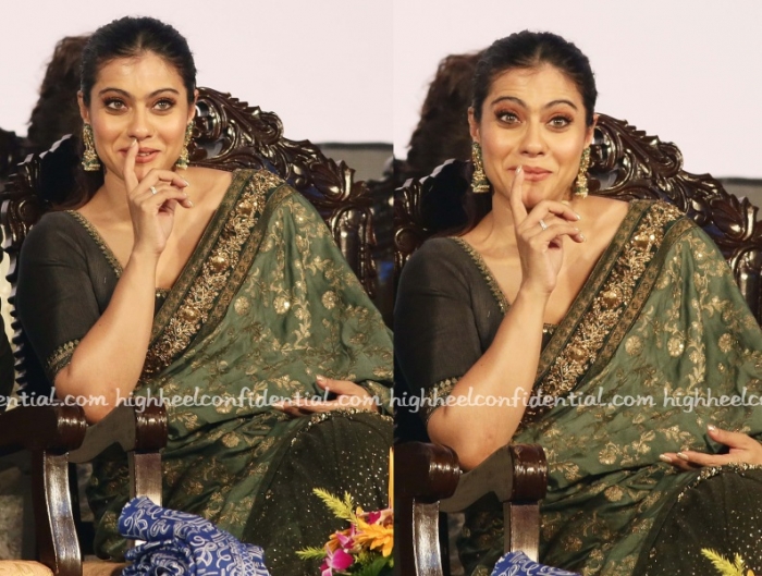 At the opening ceremony of the Kolkata Film Festival, Kajol was seen in a green Sabyasachi sari and earrings from his newly launched jewellery line.