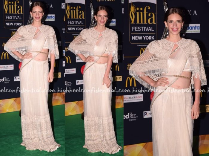 For her appearance at IIFA Rocks, Kalki picked a Sabyasachi sari to wear. With her hair pulled back in to a low knot, pink lip color and pair of simple hoop earrings rounded out the actor’s look.