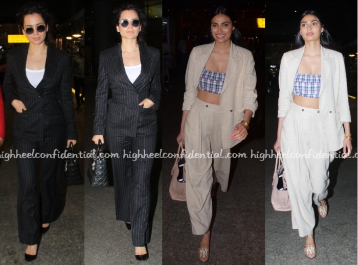Kangana’s casual suit wins hands down any day. Comfortable,stylish and relatable. Athiya’s bra top for air travel? No, thank you!