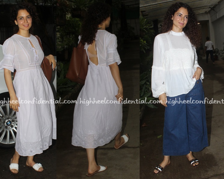 Kangana was spotted dubbing for her upcoming movie keeping it comfy in a white dress on one day and a Zara top paired with Gucci denims on the other. Between the two, have a preference?