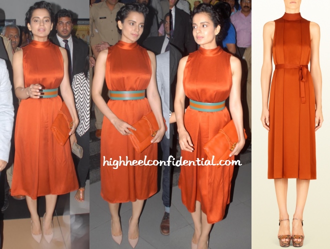 The promotions of Revolver Rani in Delhi saw Kangana in a dark orange Gucci dress. Instead of wearing the silk belt, she swapped it out for a broad leather turquoise and orange one.