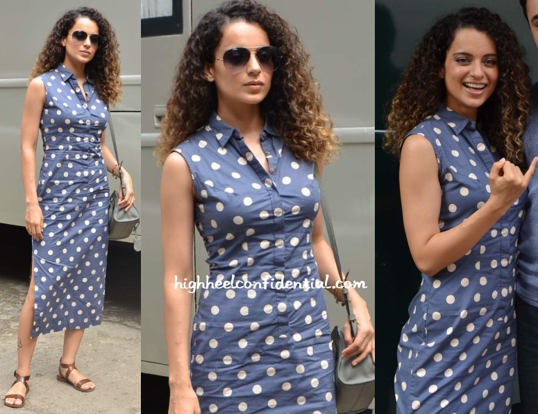 Wearing Ikai, Kangana attended promotions of Katti Batti today pairing the polka-dot dress with her McQueen bag and tan sandals. It was a laidback casual look that we quite liked. Even with the creases.