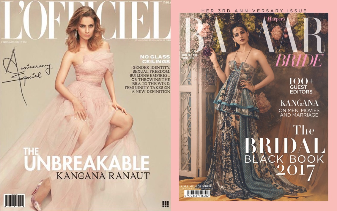 Ms. Ranaut graces the cover of two third anniversary magazine covers this month, featuring on L’Officiel’s in a pale pinkErmanno Scervino and on Bazaar Bride’s additional Her booklet in a boho avatar in Robert Cavalli and PNG Jewellers.
