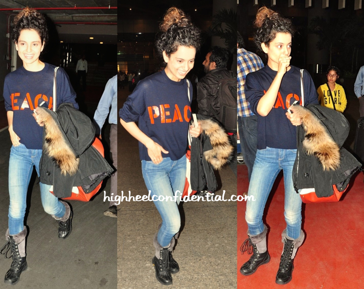 Keeping it casual in her knit top, denims and fur-lined jacket and boots, Kangana was photographed at the airport. It’s been a while since we’ve seen her go really casual on these pages and this off-duty appearance of hers sure makes for a refreshing change.