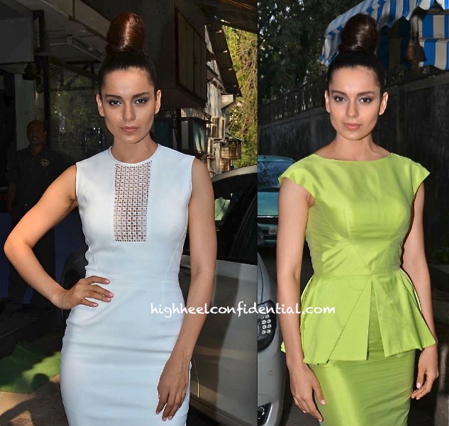 At back-to-back events promoting her movie, Kangna gave us two different looks after one quick wardrobe change. The exaggerated top knot, make-up and pumps might have been the same but the two dress couldn’t be more different from each other!