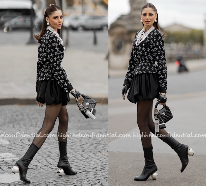 Kanika attended the Chanel show wearing Chanel head to toe with the pearl heeled calf boots that we saw on Natasha in a booties version. I normally don’t care for overdose of logo but overall, she wore the look well.