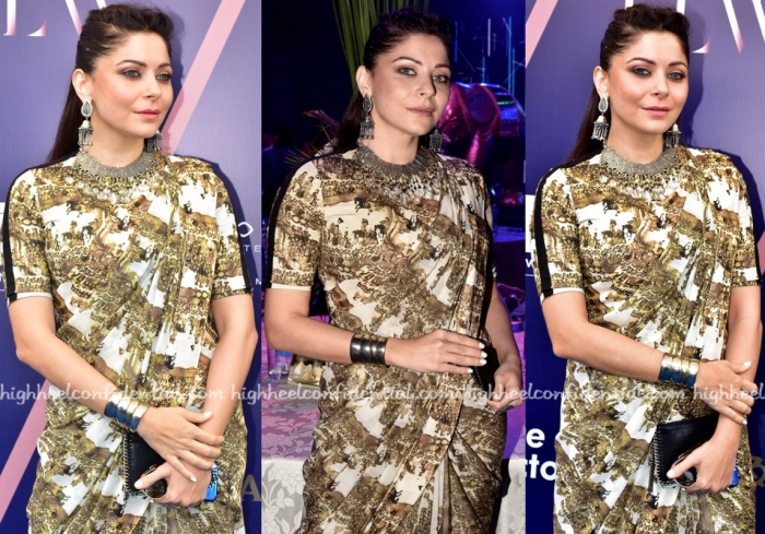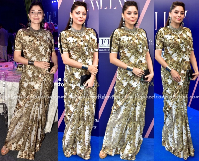 On day three of ‘Luxury Lifestyle Weekend’ in Mumbai, Kanika was photographed in an Anamika Khanna sari. Wearing her hair back, she rounded out the look with silver jewelry, a Stella McCartney clutch and pair of tan wedges.