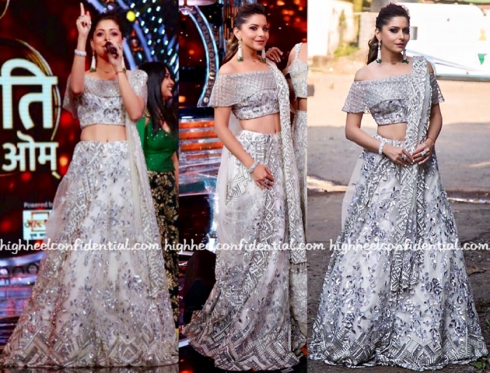 For her appearance on the sets of a television show, Kanika picked a Manish Malhotra lehenga to wear. With her hair pulled back in to a ponytail, she rounded out the look with tassel earrings and diamond jewelry.
