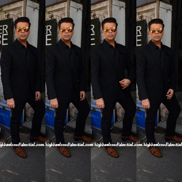 In another promotional appearance, Karan Johar did head to toe black separates with leopard printed brogues.