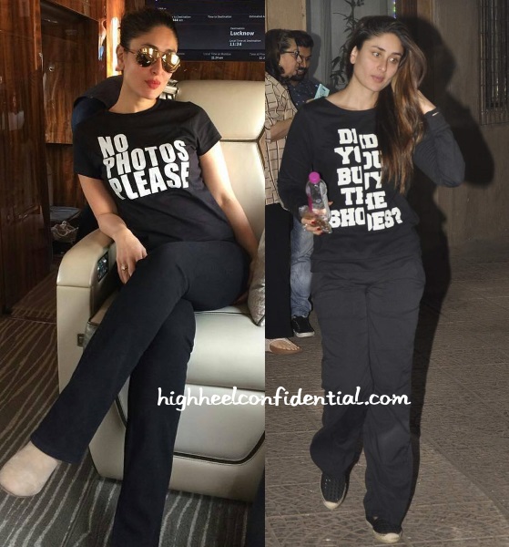 While off-duty, Kareena was seen in two black on black looks, both featuring a statement tee except considering that she seems to be posing in the left pic, wearing that tee seemed a bit pointless. 😛