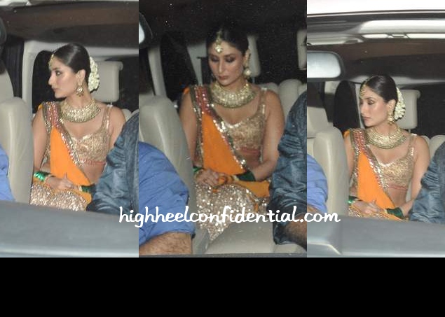 The Saif-Kareena wedding festivies began today with the Sangeet ceremony happening in Mumbai tonight. Arriving at Saif’s house wearing a glittery Manish Malhotra lehenga was the bride with mogra in the hair.