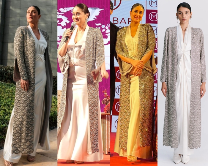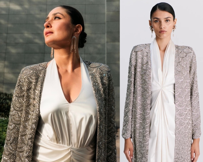 Kareena attended a store launch in Abu Dhabi wearing a silver fish-scale pattern embroidered coat and halter gown from 431-88. That jacket sure was delish but it seems like the gown was modified or custom made with a different stitching style for Ms. Kapoor if one looks closely at the model and Kareena’s version. Issue here was that at the event, the bust sat awkwardly and it showed in multiple videos. Wish she’d just worn the original version.