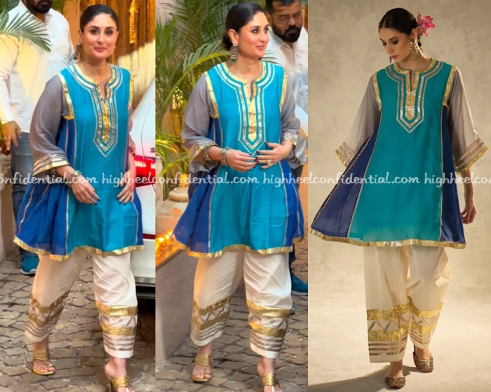 Kareena dropped by Sonam’s baby shower wearing a gota kurta set from Aavidi with kolhapuri sandals from Aprajita Toor. I feel like such salwars work better with juttis than sandals but that is my take.