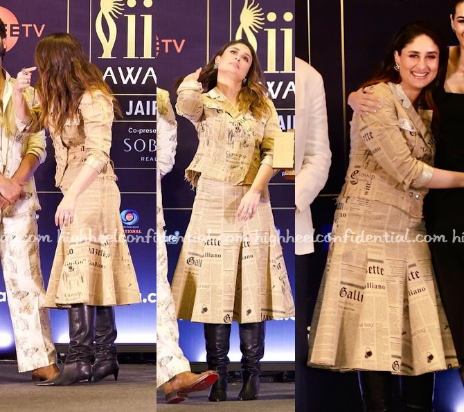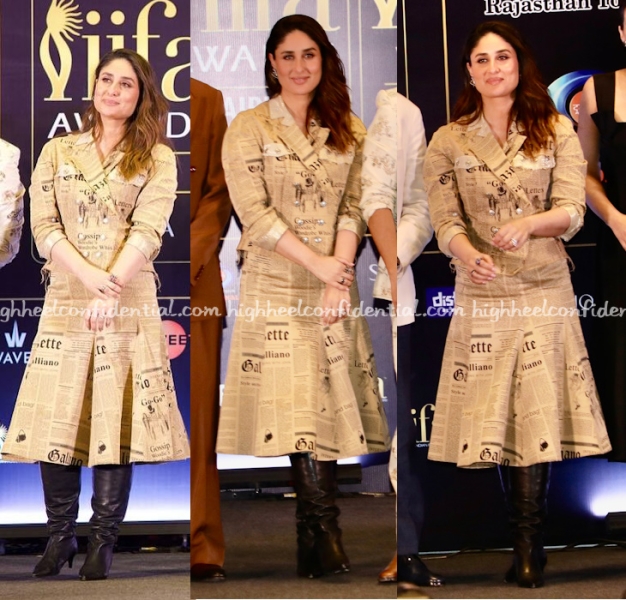 Kareena attended the IIFA 2025 press meet wearing a newspaper print jacket and skirt set from John Galliano. From a fashion perspective, to have a sighting of this iconic print is quite a big deal but I am on the fence about the boots here. They felt too heavy. Overall though, am also not sure this set works on Ms. Kapoor either. The set makes even the statuesque Ms. Kapoor look oh-so-short. This is a case of great sourcing of clothes but ending up on the wrong client.