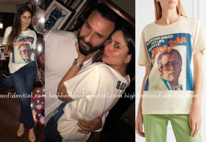Kareena rang in her birthday with family on Thursday evening and was spotted wearing a Gucci Elton John print tee with boot cut denims and beige sandals.