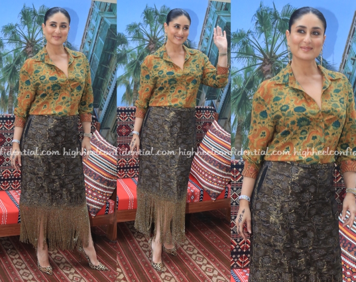 Wearing a silk woven himroo shirt from Namza paired with a fringe skirt from Re-ceremonial, Kareena attended a tourism event. Animal print pumps finished out her look. Textile wise, the himroo + the brocade made for a nice fresh pairing. Having said that, the fringe here felt overkill on the skirt.