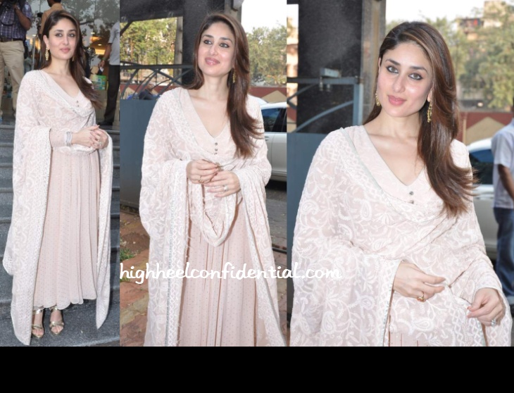 Shehla Khan’s designs seem to be everywhere and the latest to be spotted in one was Kareena wearing a pale pink suit at a book launch. Maybe its the pictures but the color seems to be washing her out.