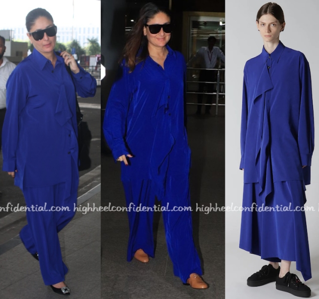 Kareena took a day trip out of Mumbai wearing Yohji Yamamoto separates first with Manolo Blahnik flats and then switchign them out for tan Hermès Kelly mules on the way back. That blue sure was striking.