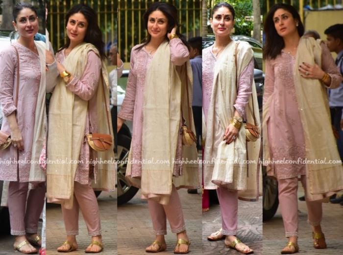 During the day, Kareena kept things simple as she partook in Diwali festivities. Teaming her suit with metallic flats and a Loewe bag, she rounded out the look with understated make-up and a bindi. It wasn’t much of a look to write home about but Kareena did look nice.