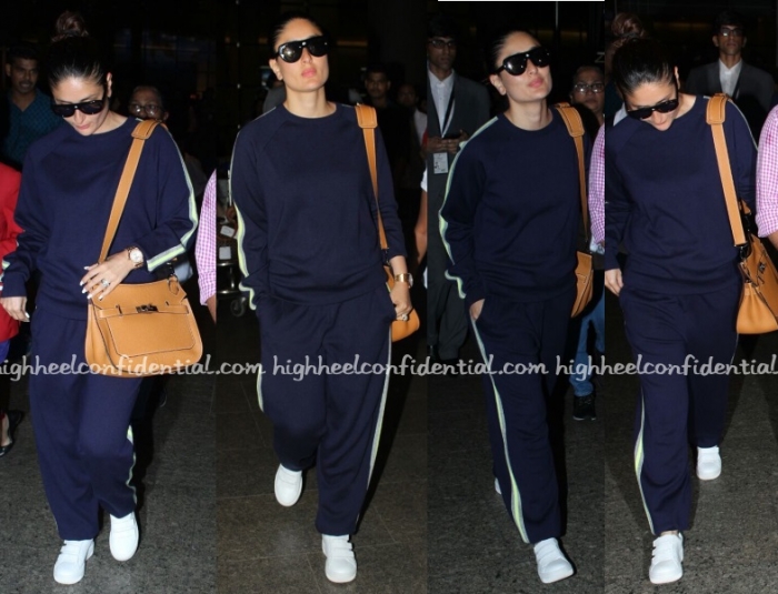 A few days after we saw Sridevi wear matching sweats, Kareena was spotted also sporting a navy combo while arriving back in Mumbai on Saturday. Her Hermès Jypsiere bag and white sneakers finished out her look.