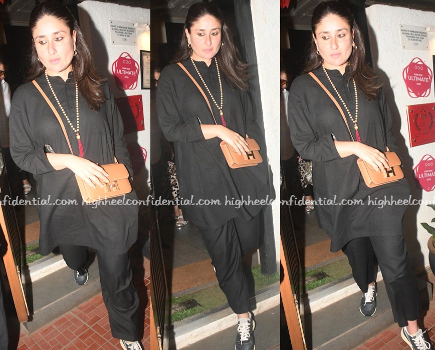 Kareena was spotted grabbing dinner with her friends wearing a black kurta and pants set with sneakers, a beaded mala type necklace and her Hermès Constance bag. Now, the sneakers combo I know is a comfort choice but still looks a wee bit odd to me.