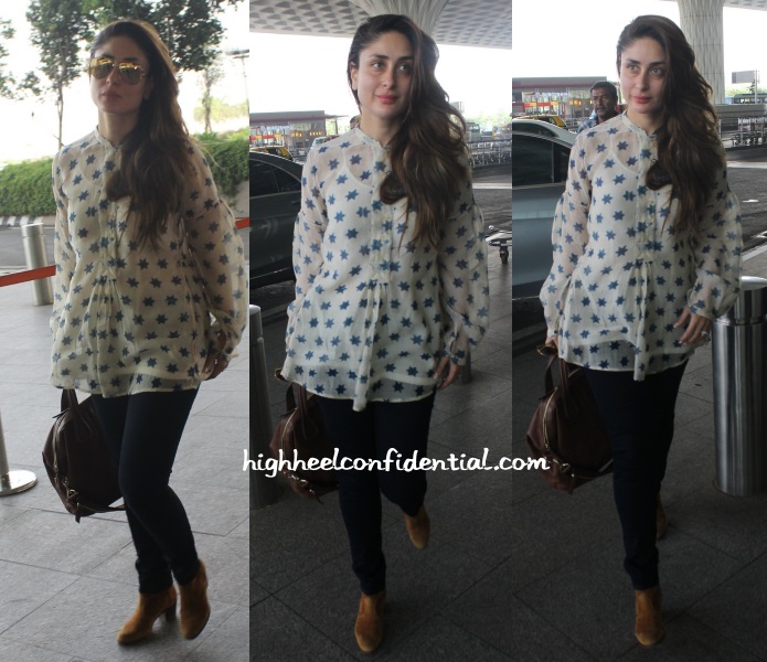 Kareena took off for Dubai early Thursday for the Times Of India Film Awards (TOIFA) picking a péro top and denims for the journey. A Givenchy Nightingale and brown boots finished out her travel look.