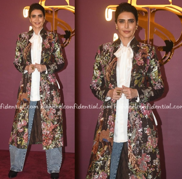 Karisma was seen at the Falguni and Shane Peacock store launch wearing sequin coat with a white bow blouse, barrel jeans and black shoes. The shirt with its bow and the barrel jeans didn’t quite work with that coat. I wasn’t liking it one bit. Did you like?