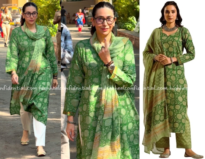 Karisma cast her vote in the Mumbai elections on Thursday and was seen wearing a cotton printed kurta set from Nainvish but with white bottoms. I actually liked the switcheroo. You?
