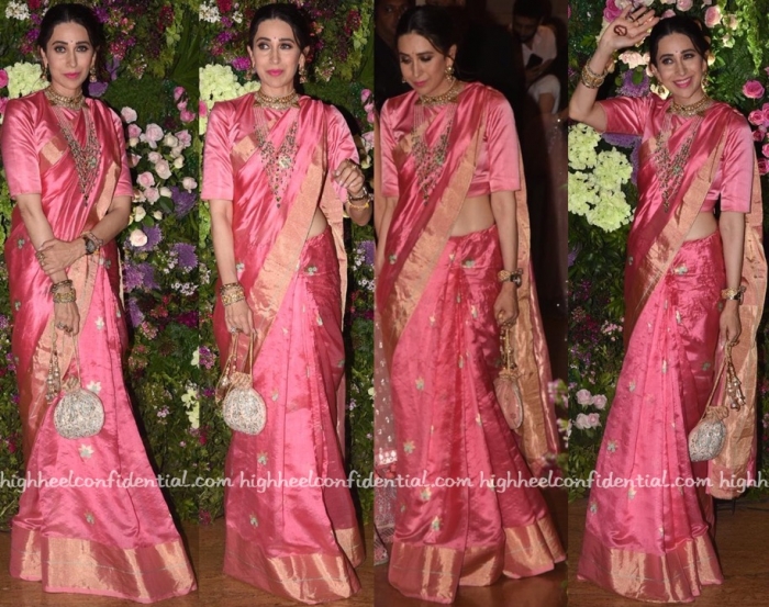 Wearing a Raw Mango sari, Karisma partook in wedding festivities. With a bindi in place, she rounded out her look with traditional jewelry and a potli. Nothing to fault here, she looked lovely.