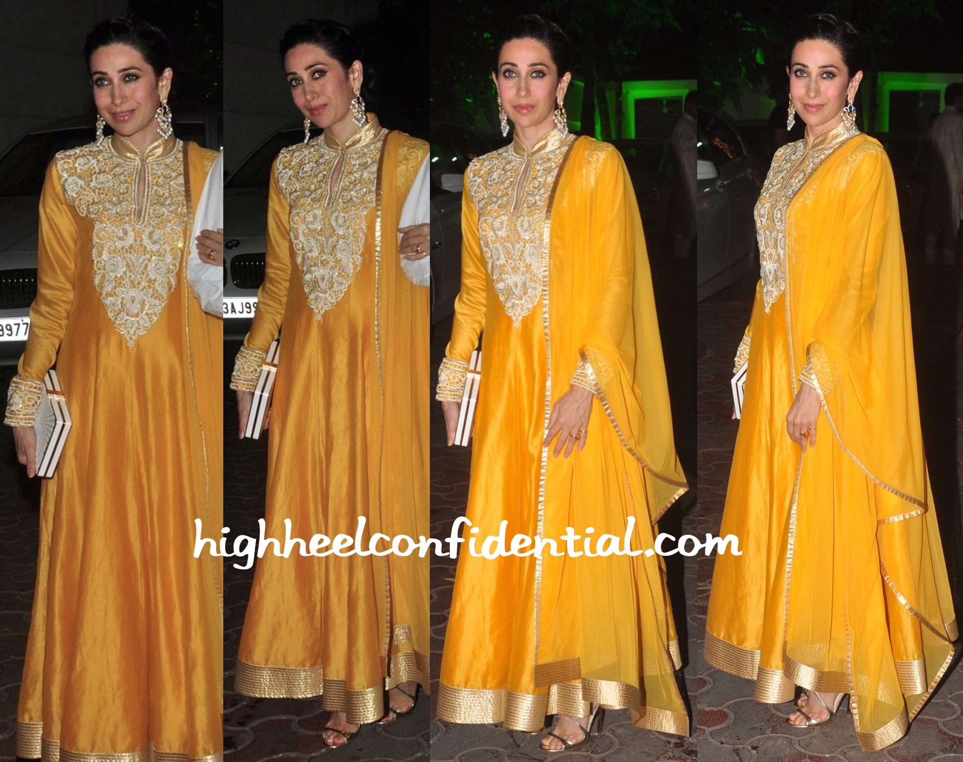 Karishma looks as lovely as a sunflower. The colour looks great on her, so is the dress, earrings, sandals and everything. Classy and flawless as always. Now this is a Rohit Bal outfit, not the one Nirja Birla was wearing.